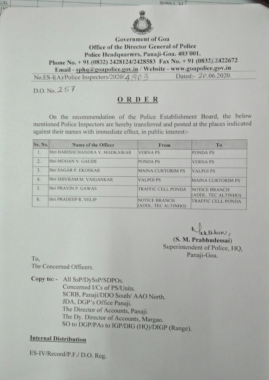 Goa Police Transfer Order Of PI's 20June2020